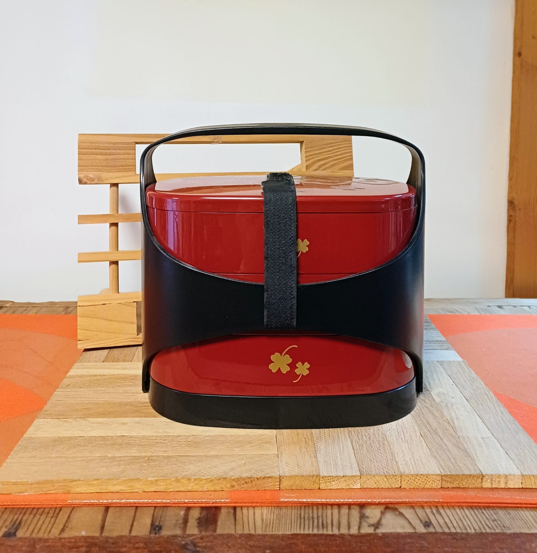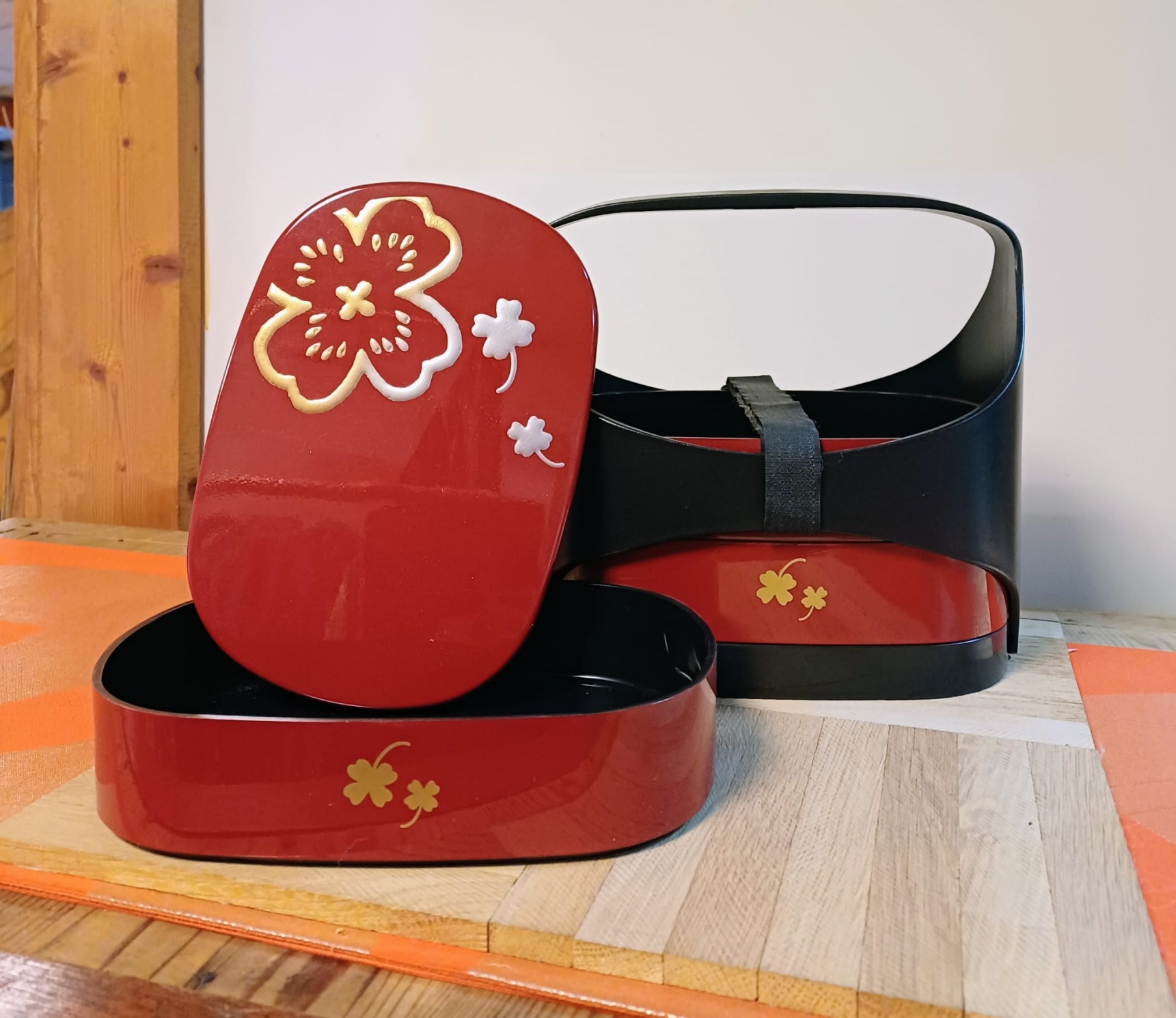 bento box ad uso picnic con 3 sezioni – capacità per sezione 770ml – misure 19x14x15 – laccato in rosso con disegni di sakura – prodotto made in Japan Kanazawa area