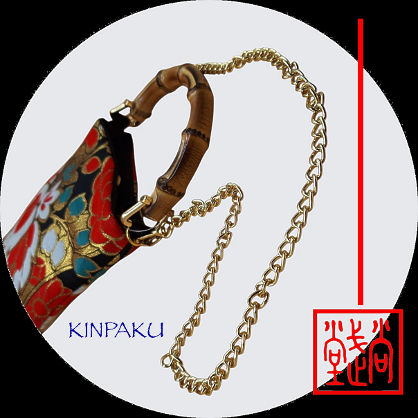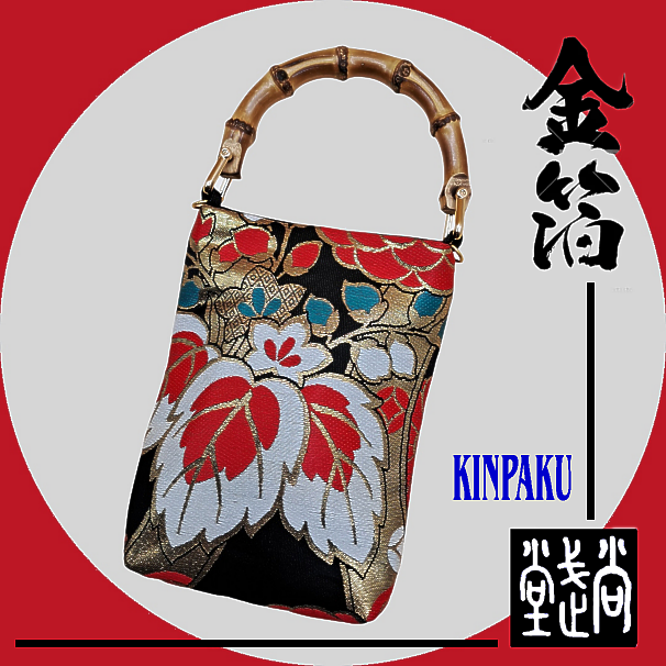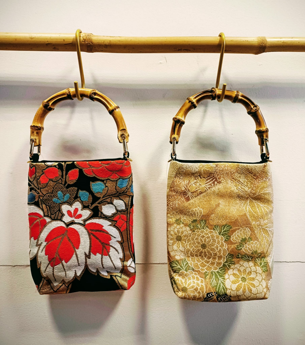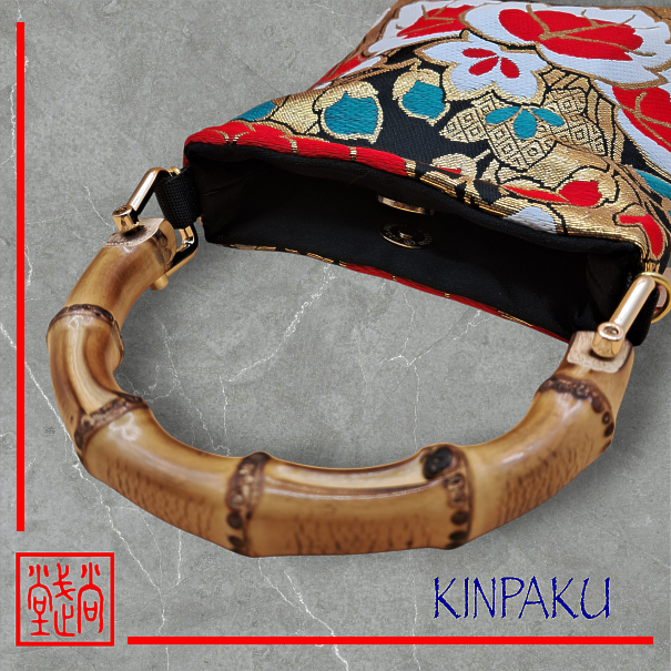 Mini borsetta in broccato con manico in bamboo originale , chiusura con bottone a pressione.