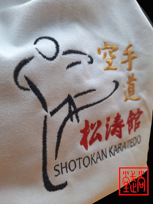 Ricamo “SHOTOKAN KARATEDO” con karateka stilizzato.
