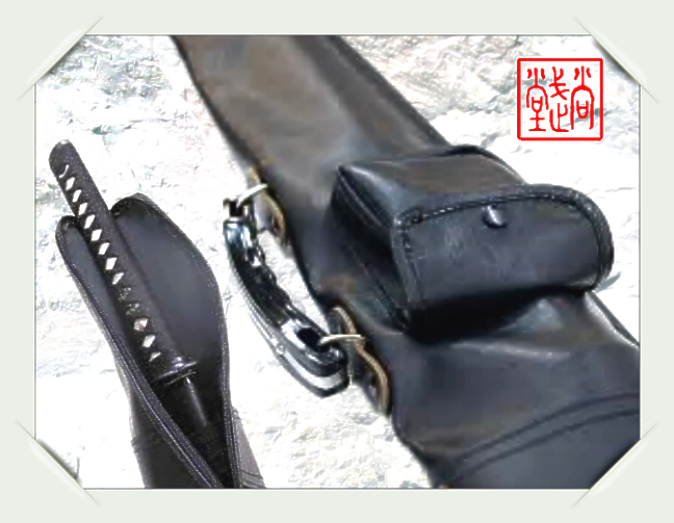 Sacca per iaito in semipelle, colore nero, tracolla regolabile e maniglia tipo valigia. Taschino esterno per accessori.