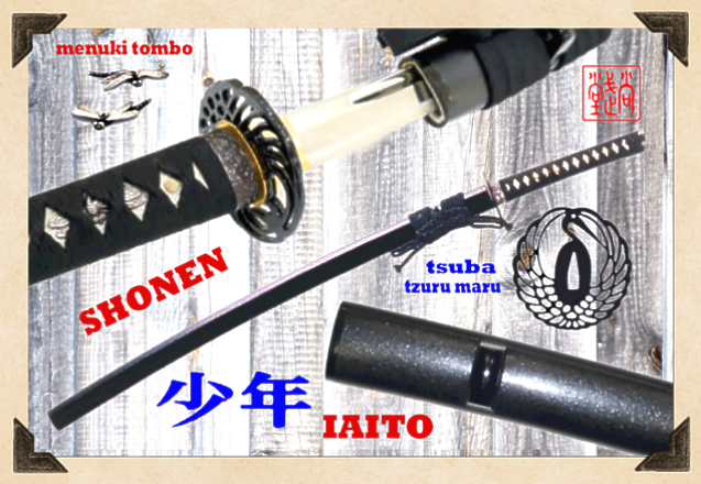 Iaito per ragazzi, Shonen misura 2.2 saya nera Hishime, tsuba Tzurumaru, menuki tombo