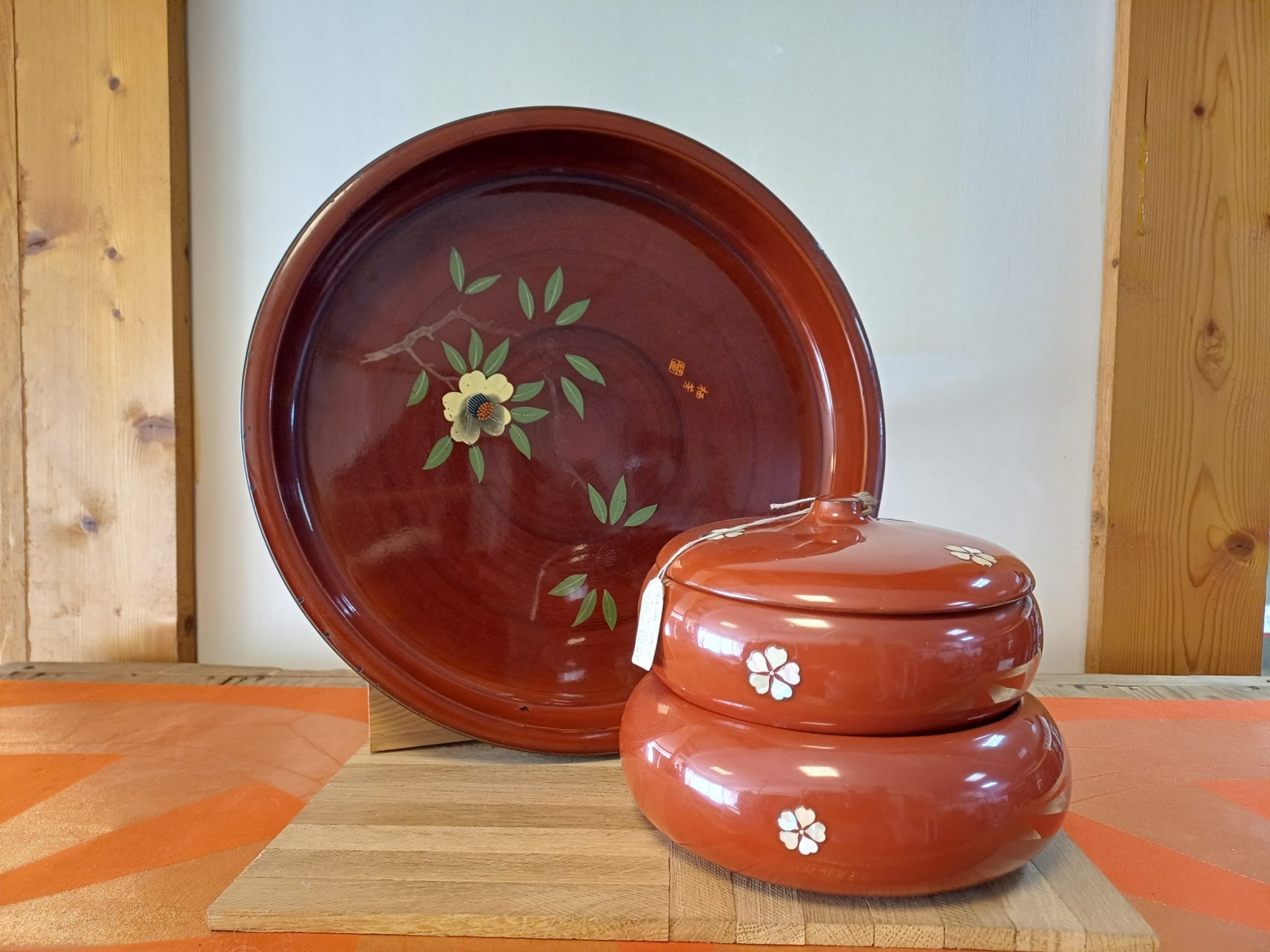 trattasi di set composto da : una scatola impilabile in 2 parti realizzt a con tecnica urushi ( laccatura giapponese ) con decorazioni maki-e in madreperla a rappresentare fiori di sakura Il vassoio è decorato con motivo floreale sicuramente dipinto a mano raffigurante un ramo con fiore giallo crema e foglie verdi – Il set è un prodotto vintage in legno laccato – periodo primi anni era Showa – made in Japan Nogizaka Tokyo area