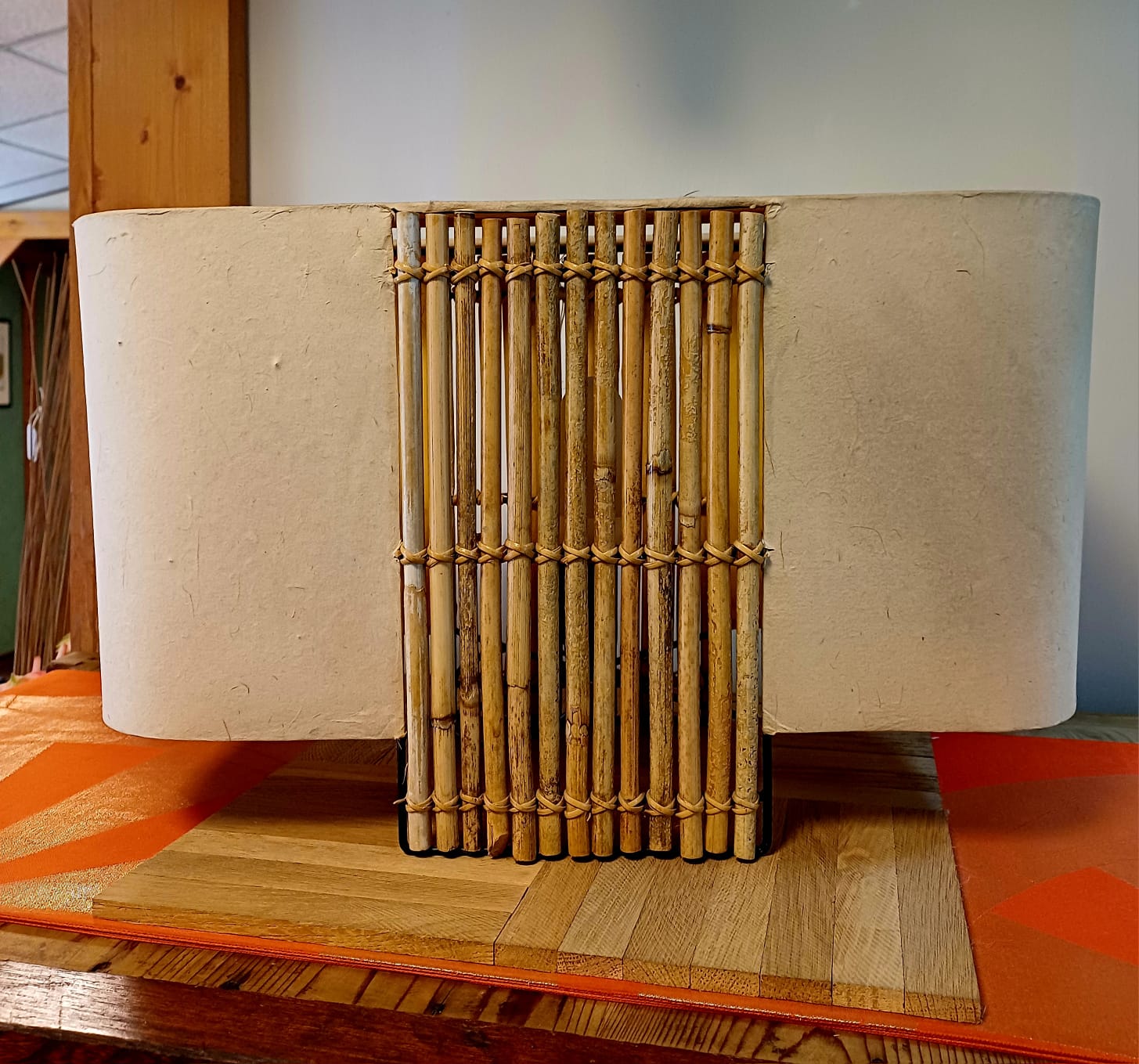 lampada intelaiatura in metallo con paralume in lattice tipo carta Washi e decorazioni in stecche bamboo. completa di impianto elettrico.