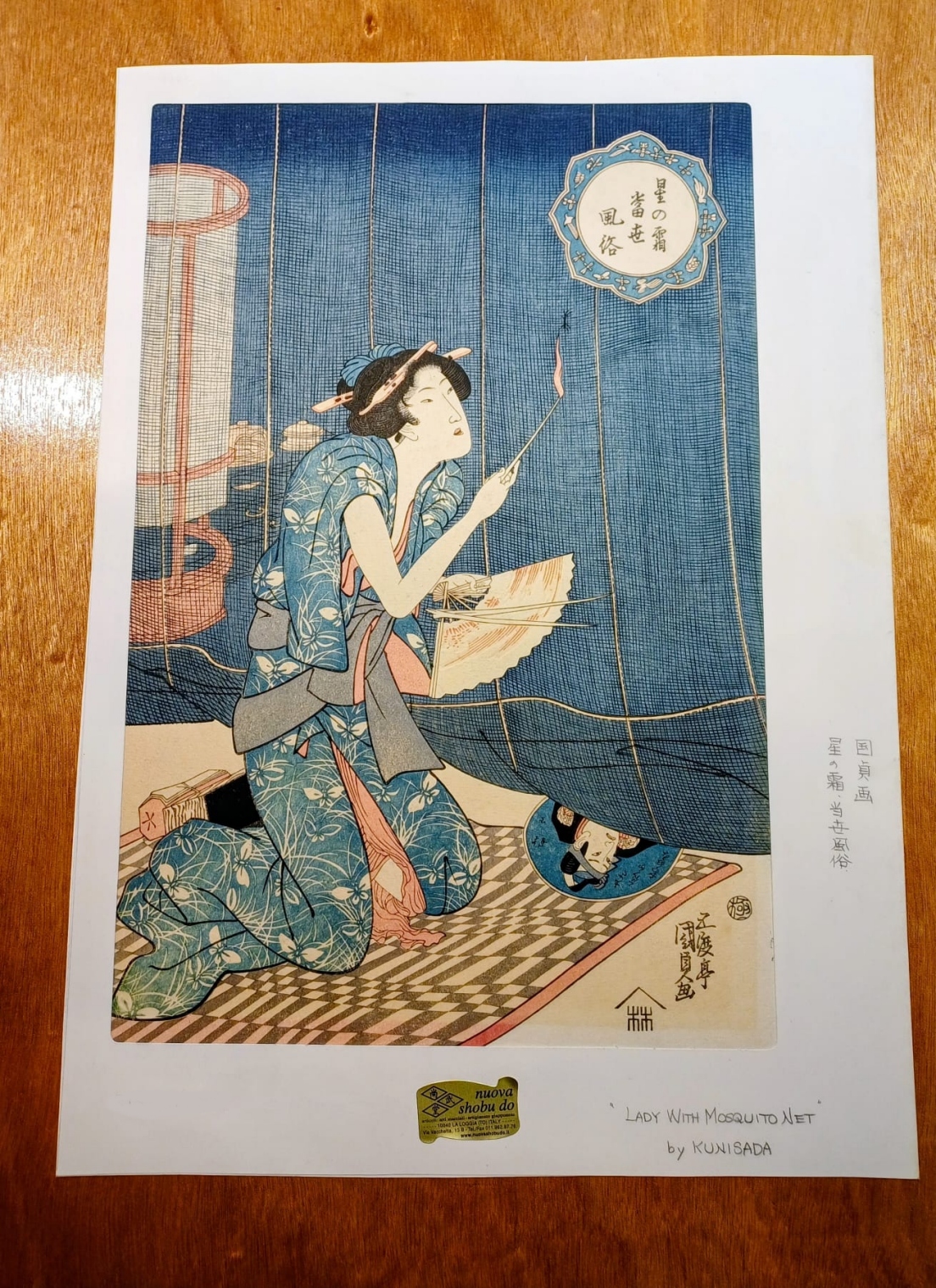 Questa è una ristampa giapponese Ukiyo-e dal titolo “Lady with Mosquito Net” (Donna con zanzariera), creata dall’artista Utagawa Kunisada.(1786-1865) Qui è raffigurata una donna in un interno tradizionale, seduta sui tatami , intenta ad accendere una lampada o un incenso. Nella cultura Giapponese la rete oltre che rappresentare una discreta protezione dalle zanzare , dava una certa intimità specialmente nei quartiri del piacere ( vedi Yoshiwara a Tokyo )