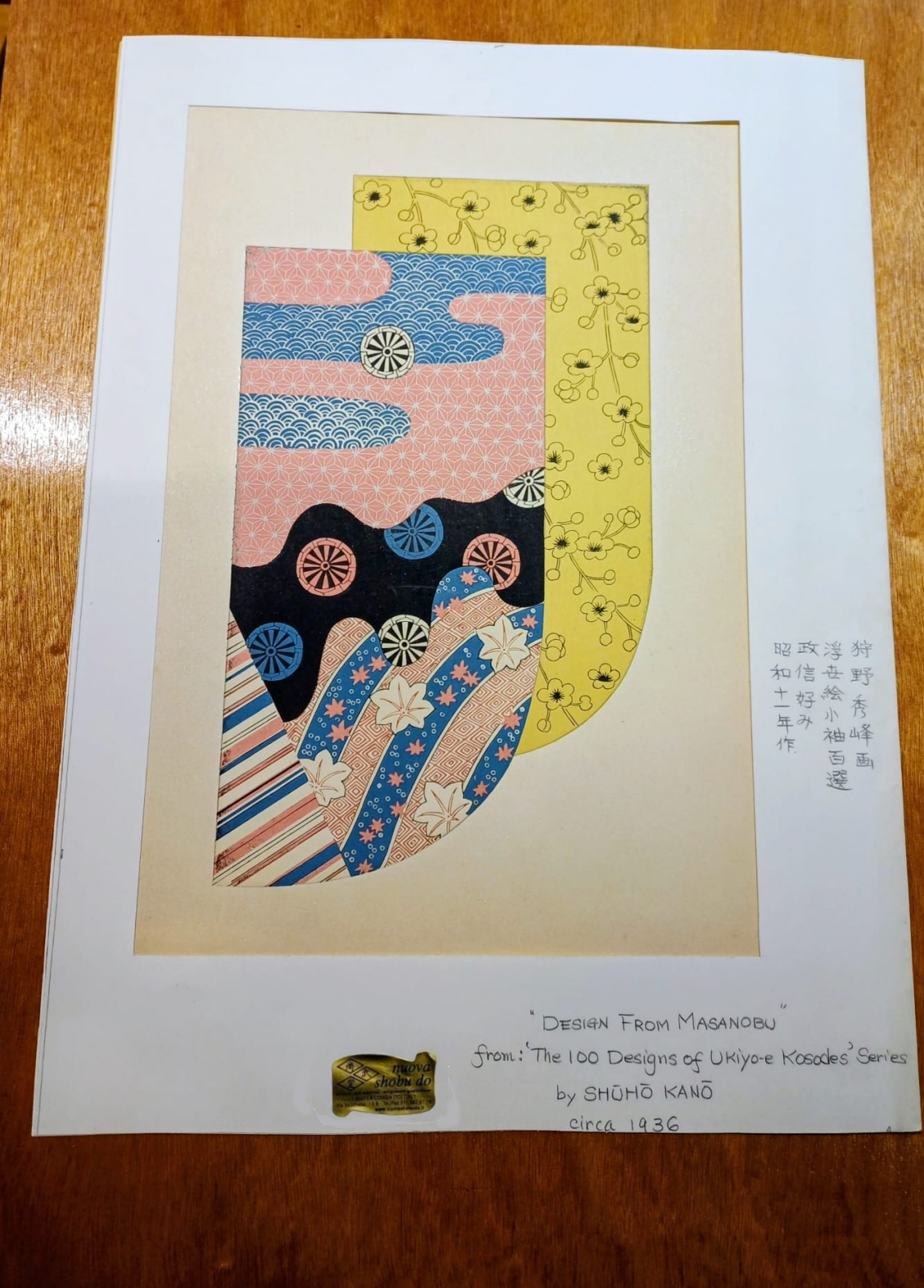 Interessante stampa di Kano Shuo facente parte della serie ” i 100 disegni di Kosode ( piccole maniche di kimono )” in qusta stampa vediamo in giallo morivi floreali di sakura e in primo piano ruote Mizu kuruma con motivi geometrici Seigaiha ( onde del mare ) e Asanoha – periodo Showa 1936 – ottime condizioni