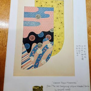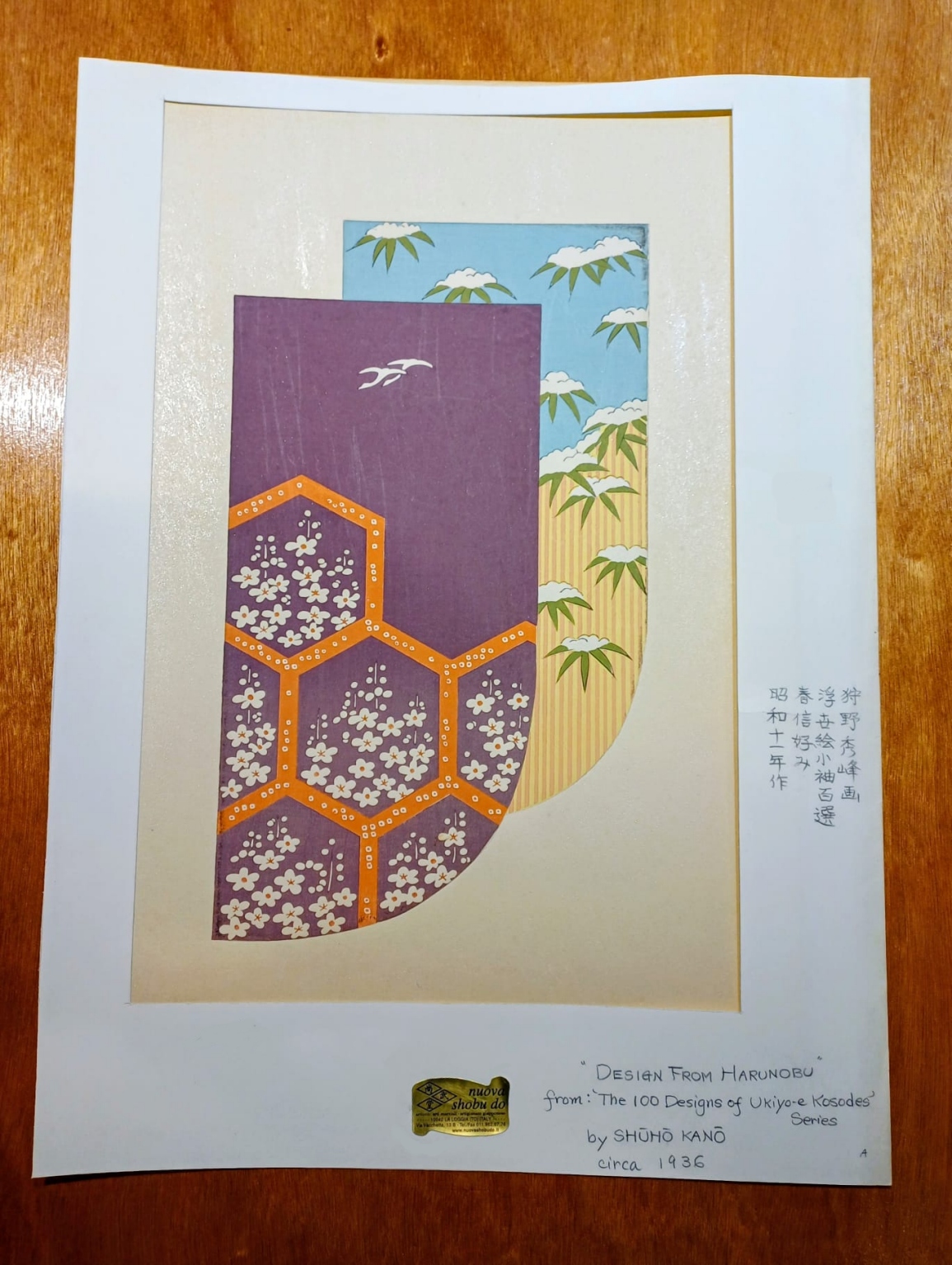 Interessante stampa di Kano Shuo facente parte della serie ” i 100 disegni di Kosode ( piccole maniche di kimono )”  in qusta stampa vediamo in primo piano motivi floreali forse fiori di sakura e in secondo piano foflie di Take ( banboo ) ricoperte di neve – periodo Showa 1936 – ottime condizioni