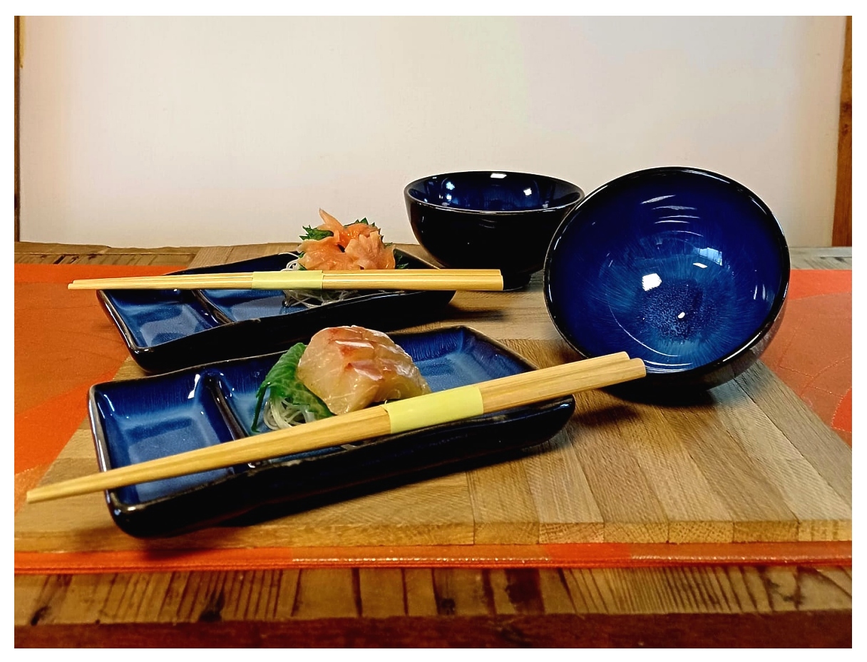 Sushi set blu scuro Aone. Composto da 6 pezzi: ciotole per riso, piatti per maki sushi e chop stick