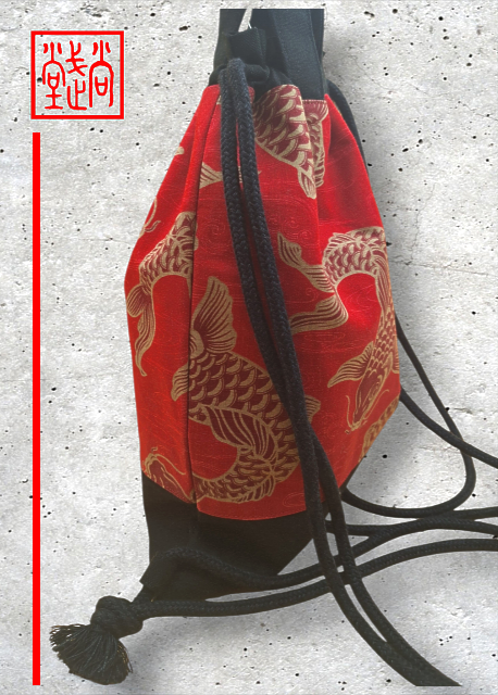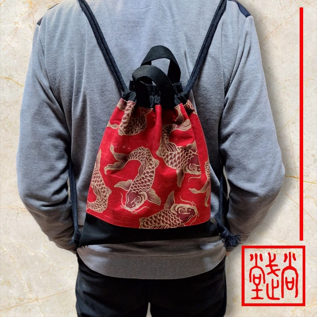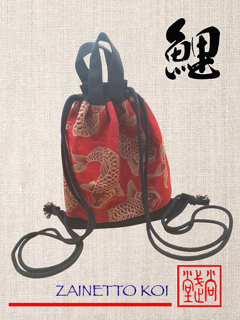 Zainetto in tessuto giapponese 100% cotone, disegni carpe giapponesi KOI – colore rosso, chiusura a strappo.